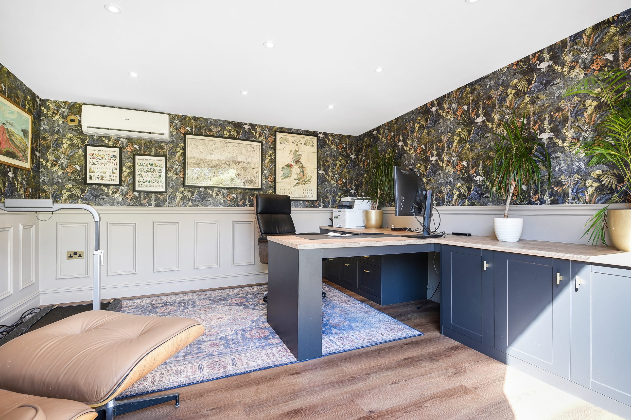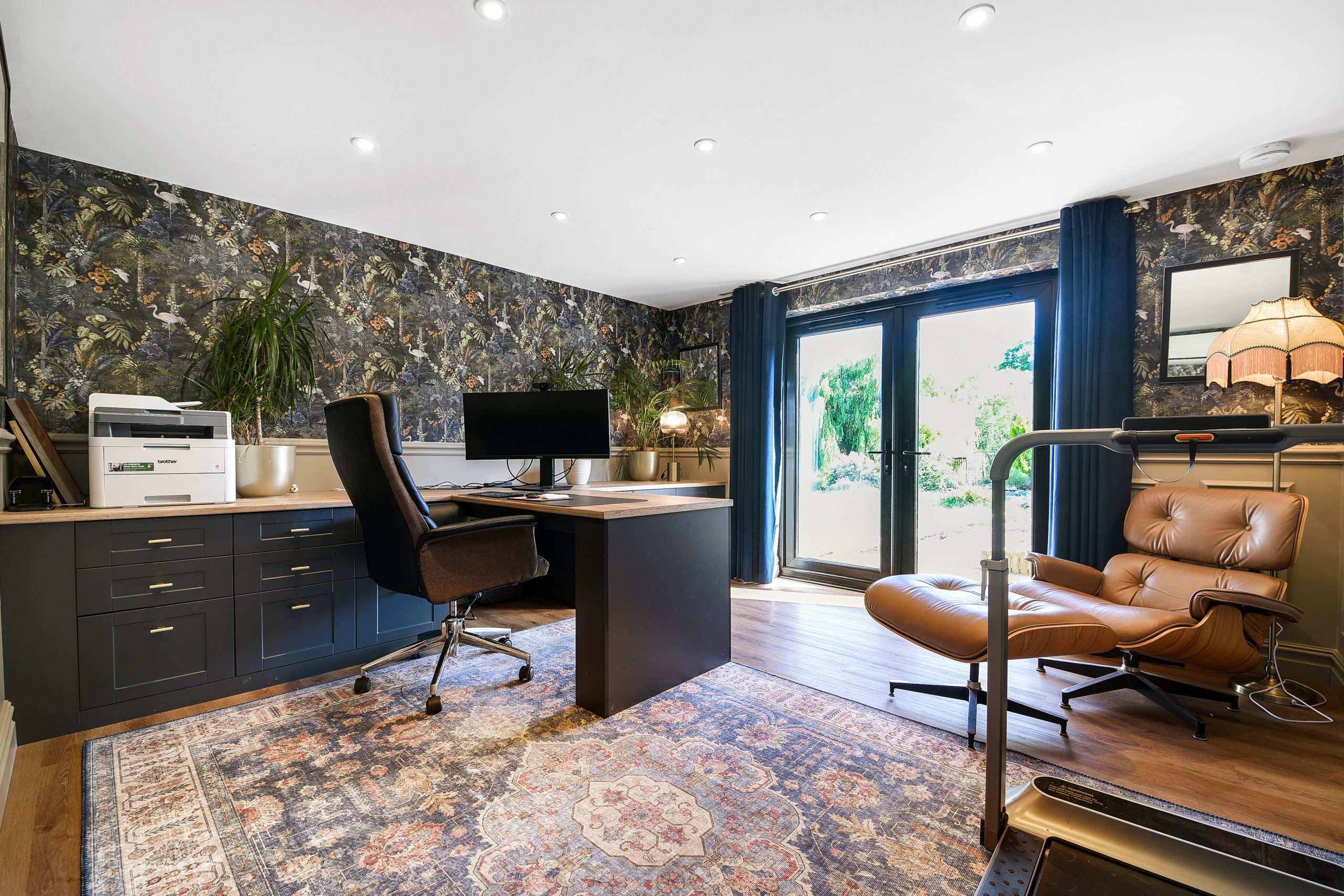 In contrast, the second office takes on a lighter, more playful character, with funky wallpaper featuring birds, leaves, and flowers on the top half of the wall, balanced by cream panelling below. The vibrant theme continues with curated artwork and maps, including striking angel wings as a focal point. A dark blue desk and matching cabinets provide practical work surfaces, while a leather chair and stool create a comfortable seating area. A walking pad tucked into the corner allows for movement without leaving the office. Blue patterned rugs and curtains unify the colour scheme, while French doors bring in natural light and garden views, enhancing focus and wellbeing.