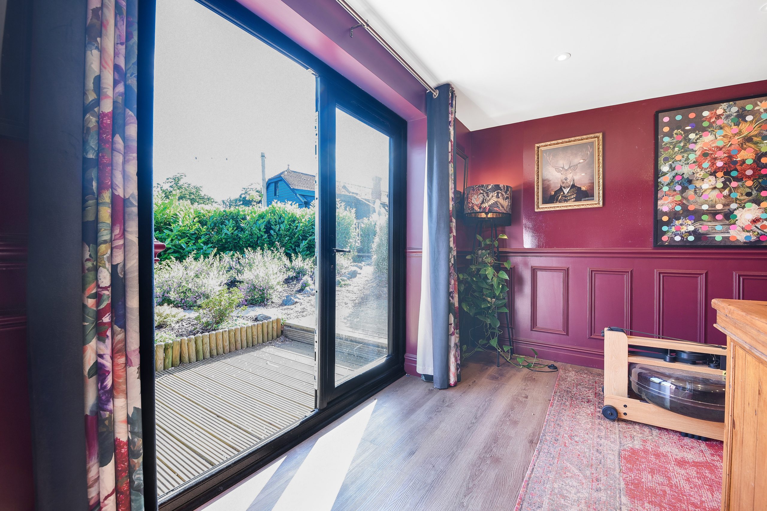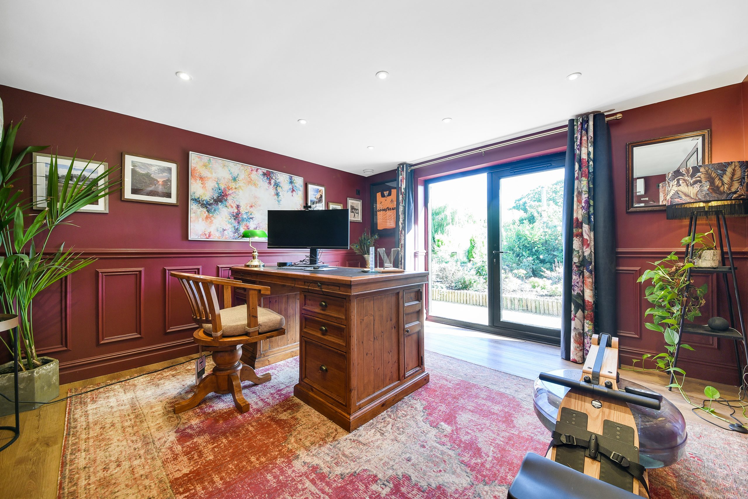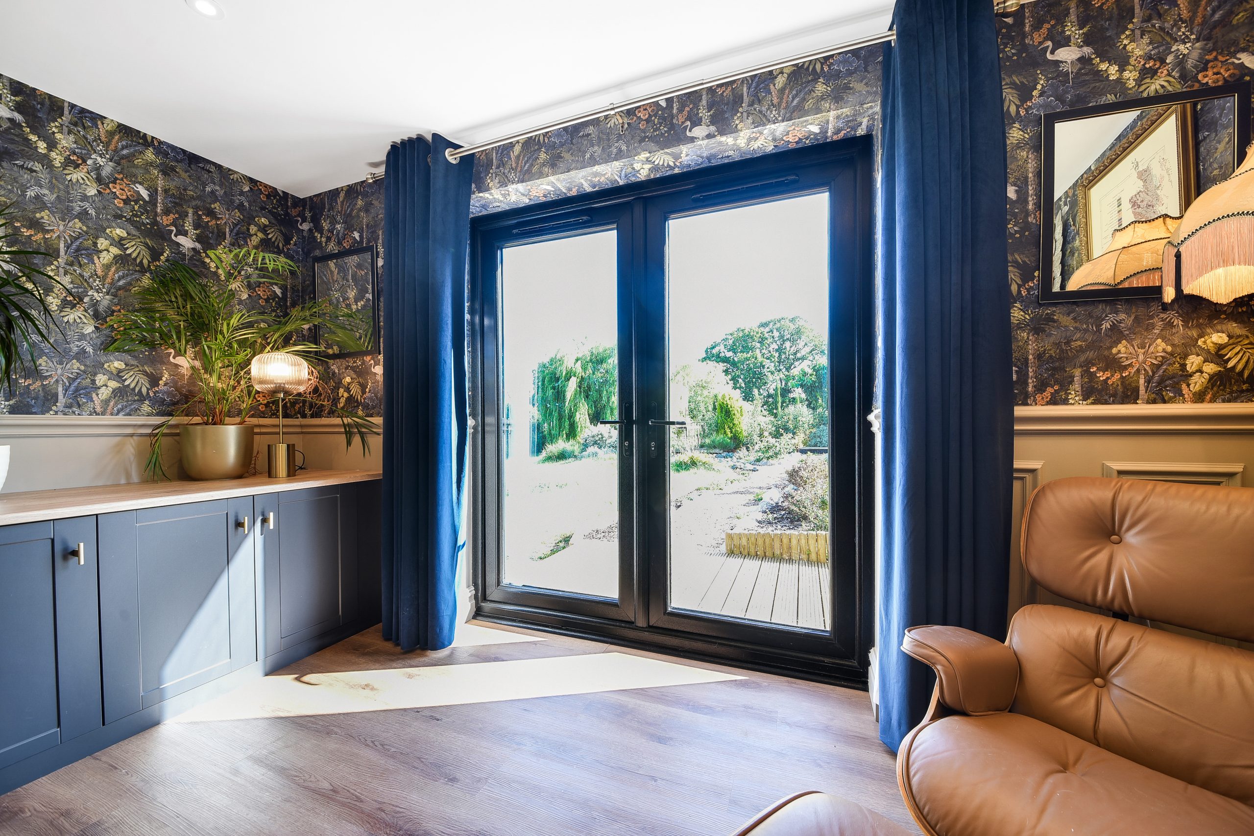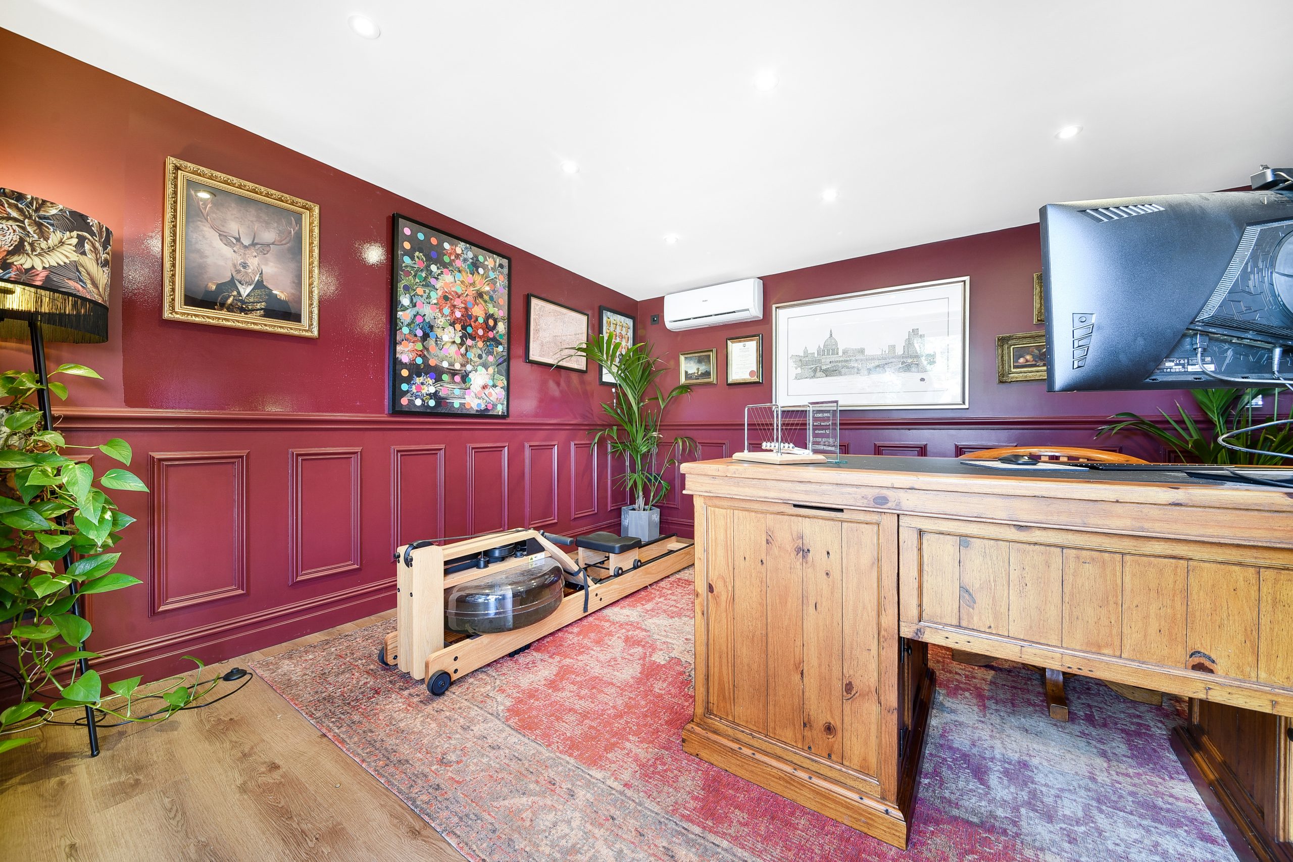 A solid wood desk provides a substantial and stylish workspace, while a rowing machine in the corner encourages wellness alongside work. Patterned blue curtains frame the French doors, completing the look and tying together the rich colour palette. From the desk, the garden views offer a calming backdrop, blending productivity with serenity.