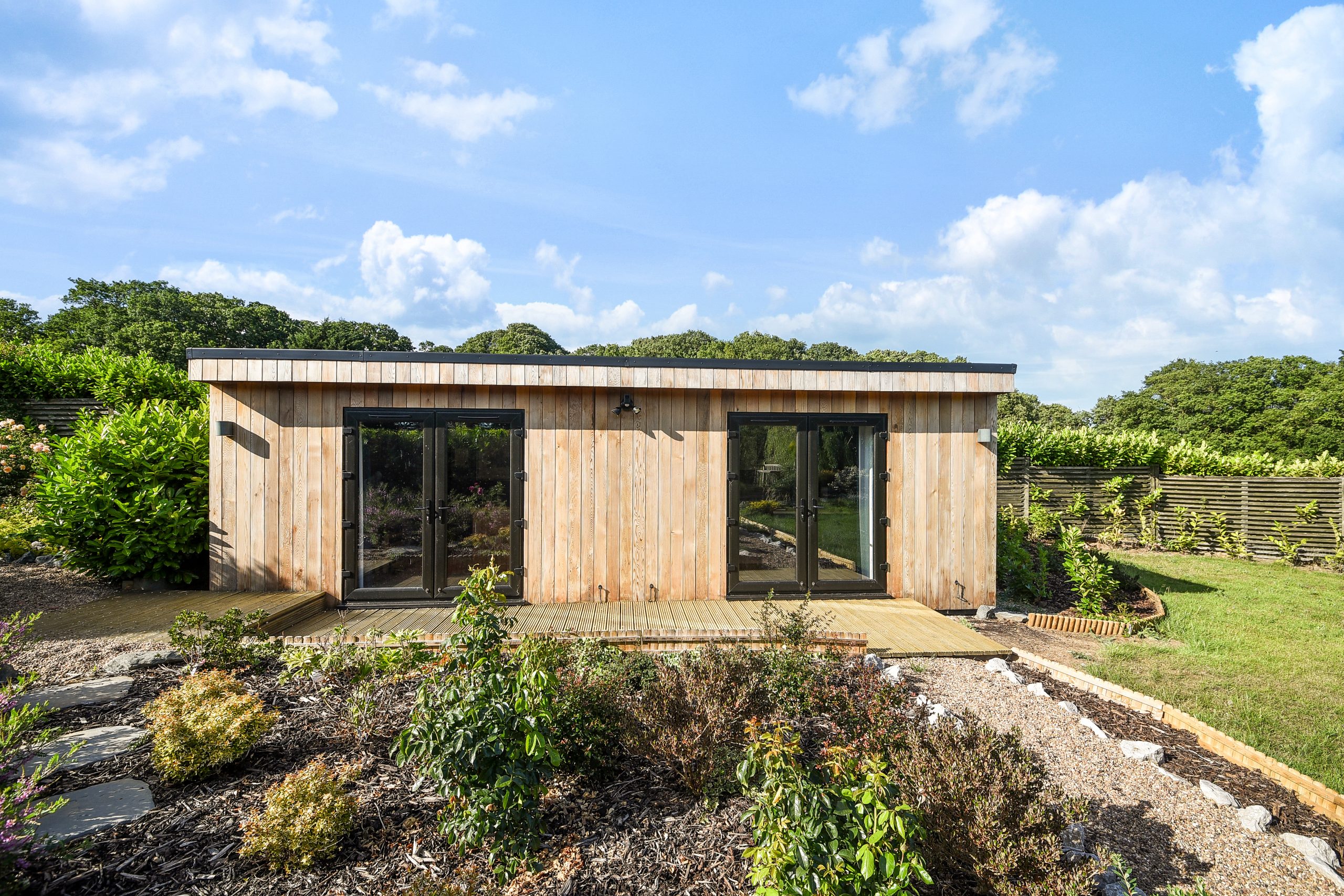 The exterior of the garden room features natural cedar cladding, giving it a warm, timeless appearance that complements the surrounding greenery. Double French doors open into each office, allowing abundant natural light to flood the interiors and providing direct views of the garden, making each workspace feel open and inviting.