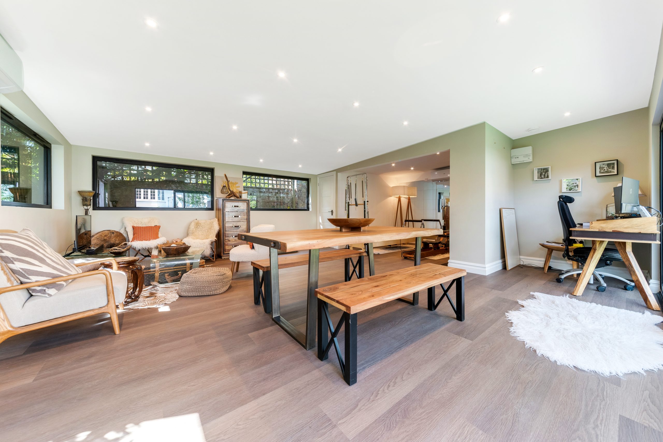 At the heart of the garden room, in front of the sliding doors, a large wooden dining table and matching benches provides the perfect space for family meals, entertaining guests, or social gatherings. Behind this, a cosy corner offers a more relaxed setting, with a mix of different styles of chairs and beanbags arranged on an animal skin rug, surrounding a glass coffee table. A TV under the window completes the area, creating a comfortable spot for lounging, reading, or enjoying entertainment.