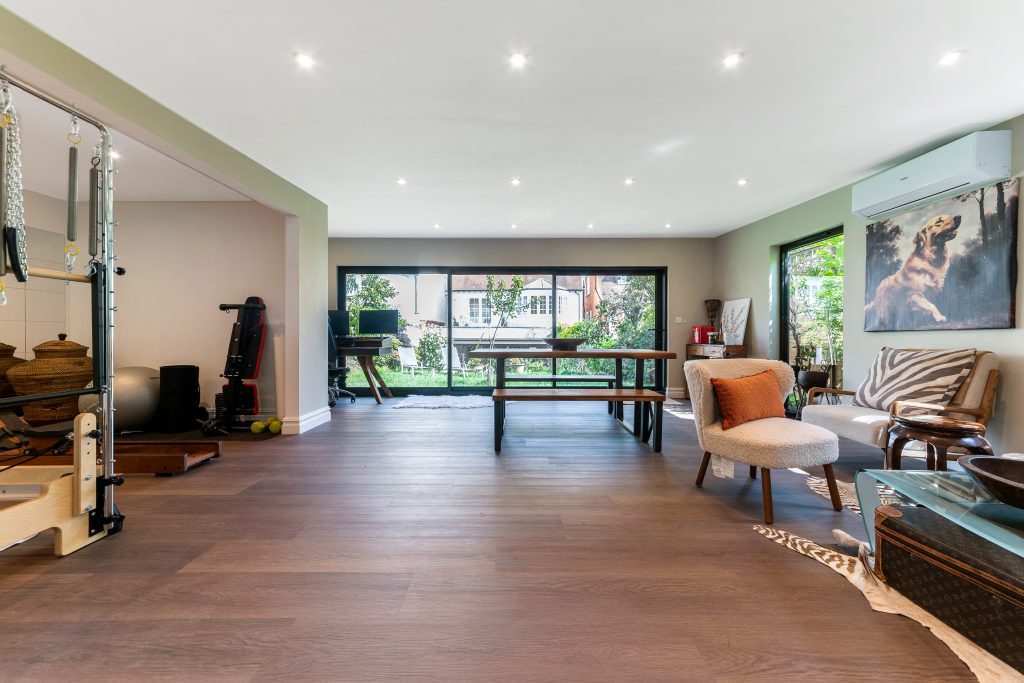 Inside, the garden room has been painted a soft light green, paired with wooden floors, creating a calming and natural environment. Carefully considered lighting includes roof spotlights and a freestanding lamp in the gym area, ensuring that each zone is bright, welcoming, and functional at any time of day.