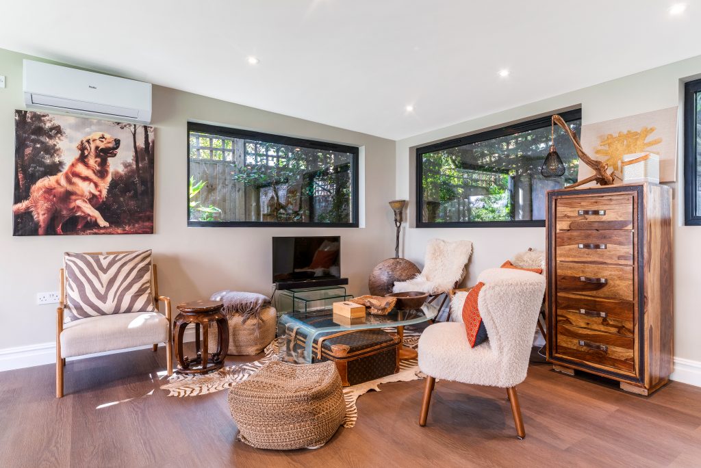 At the heart of the garden room, in front of the sliding doors, a large wooden dining table and matching benches provides the perfect space for family meals, entertaining guests, or social gatherings. Behind this, a cosy corner offers a more relaxed setting, with a mix of different styles of chairs and beanbags arranged on an animal skin rug, surrounding a glass coffee table. A TV under the window completes the area, creating a comfortable spot for lounging, reading, or enjoying entertainment.