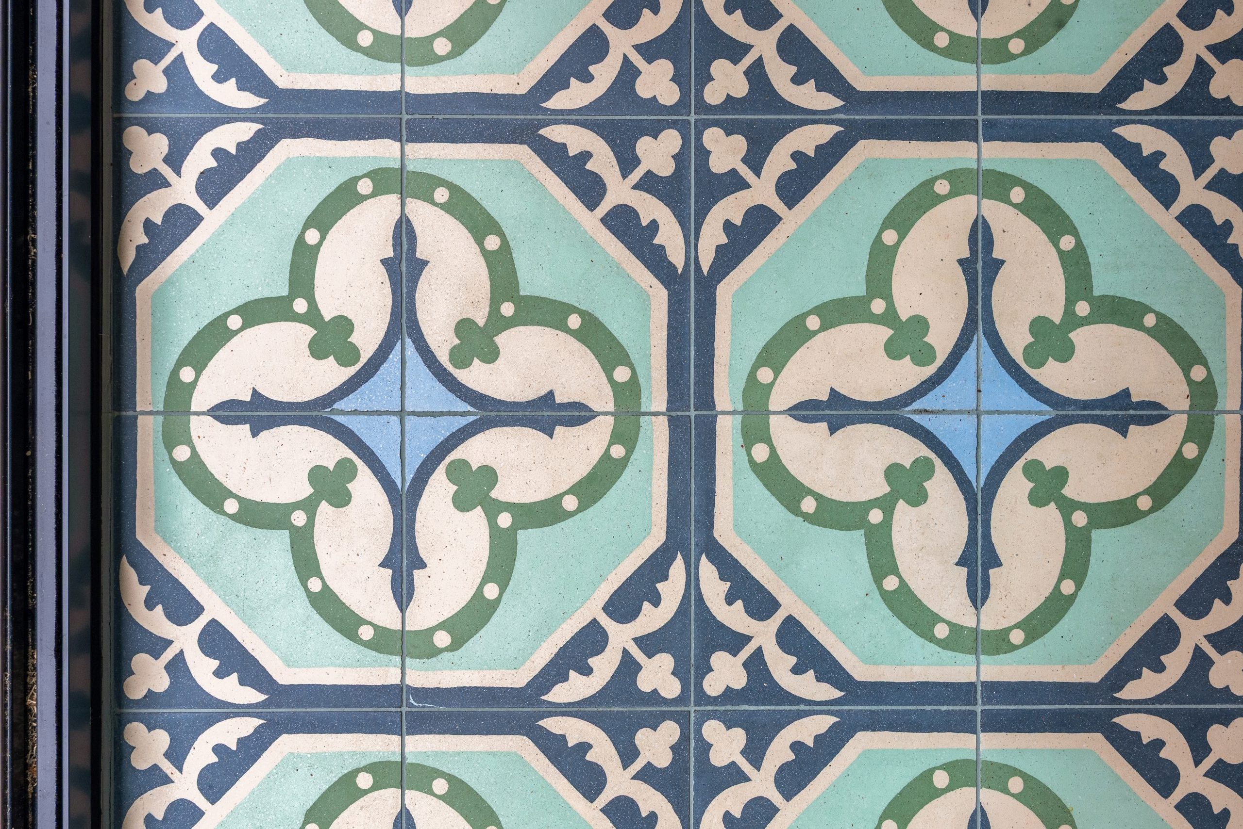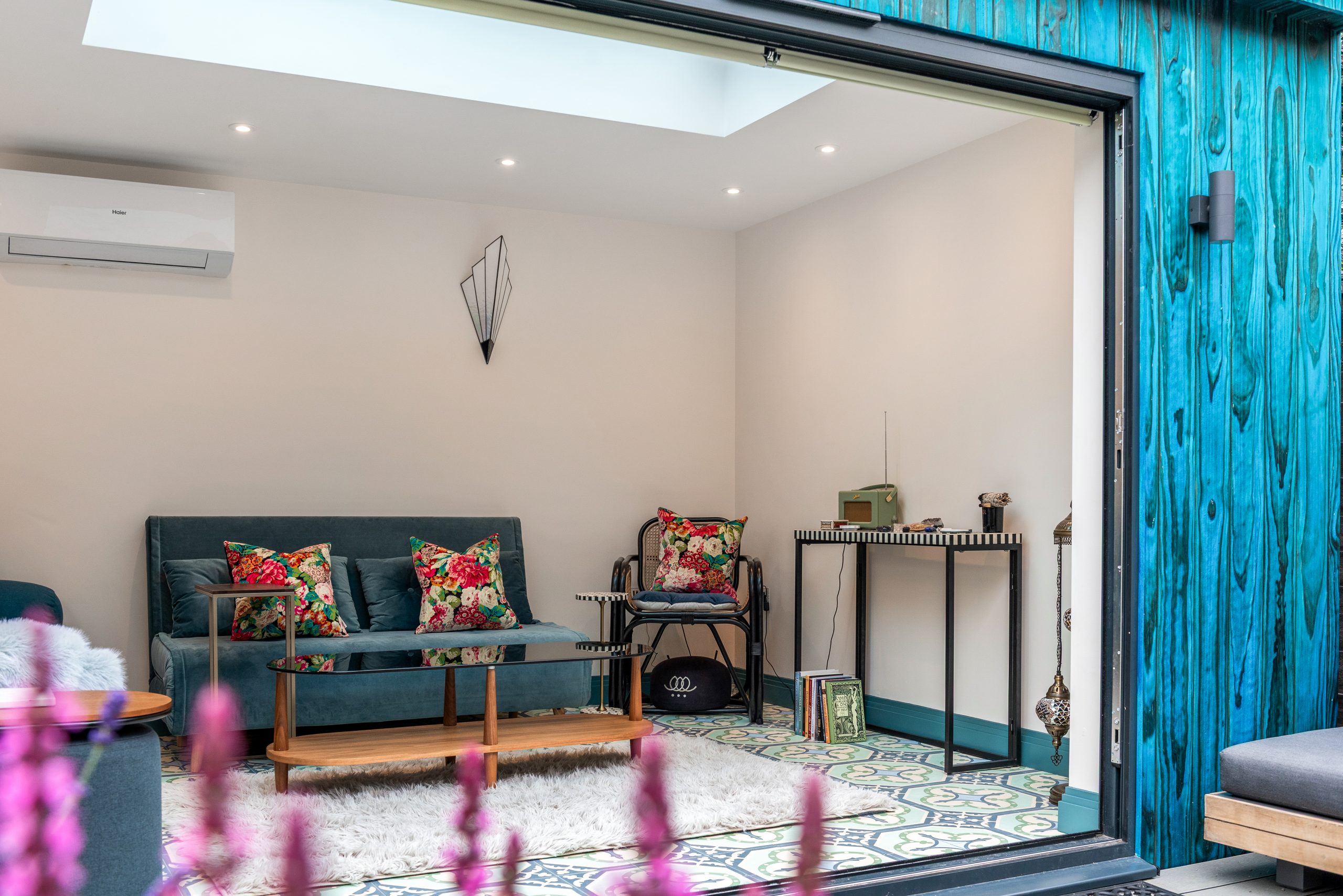 Step inside, and the sense of vibrancy continues. The interior design embraces a bold blue theme, creating a cohesive aesthetic that flows from the exterior cladding to the décor within. The standout feature is the encaustic tile floor, which brings pattern, warmth, and a touch of vintage charm to the space.