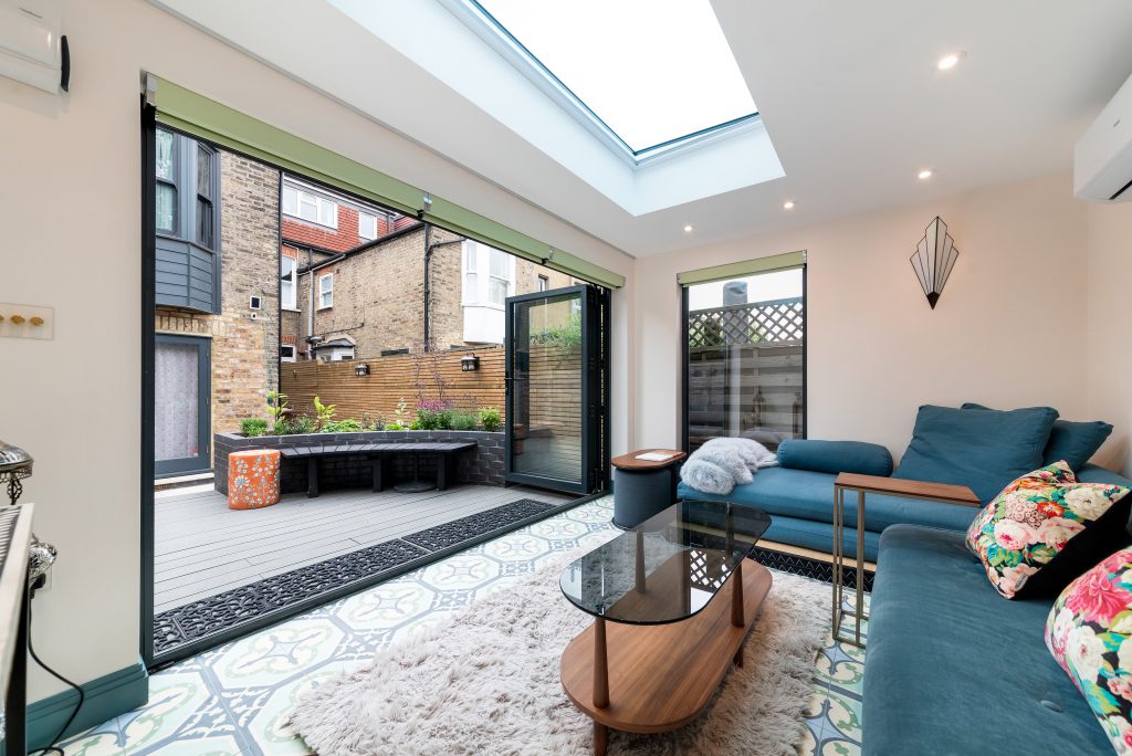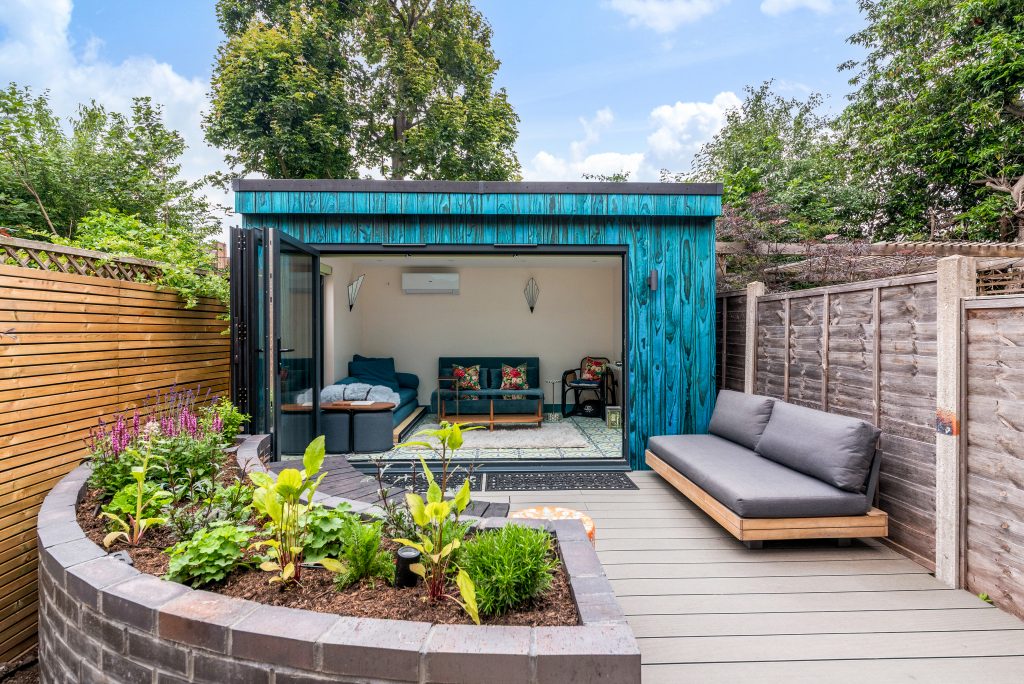 Across the front elevation, bifold doors open the full width of the garden room, extending the interior seamlessly onto the decking area outside. Here, outdoor seating and a comfortable sofa create an additional lounging zone, perfect for relaxing on sunny days, hosting guests, or enjoying a quiet evening surrounded by the garden’s greenery. This fluid connection between indoor and outdoor spaces gives the small footprint an expansive, open feel.