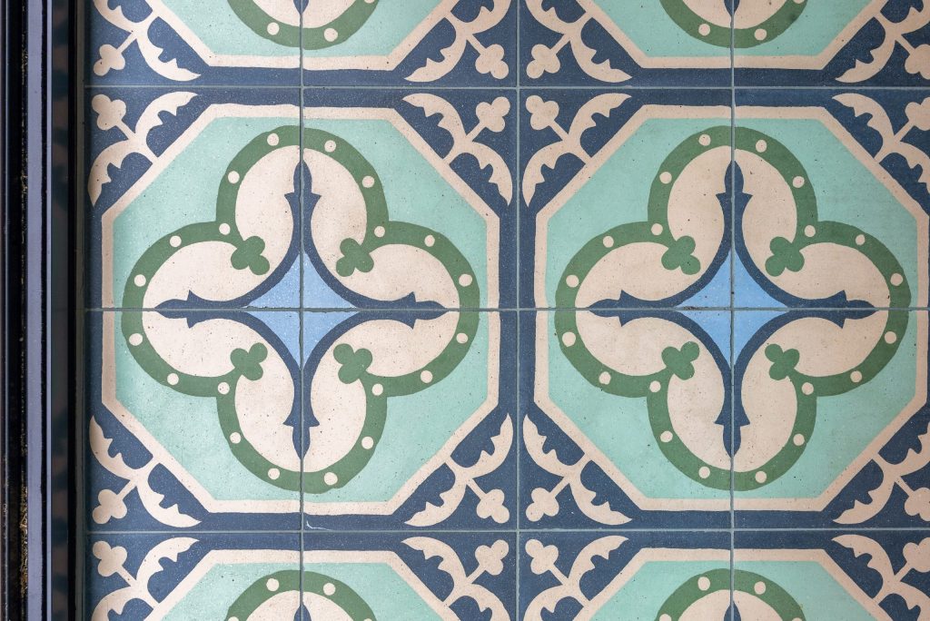 Step inside, and the sense of vibrancy continues. The interior design embraces a bold blue theme, creating a cohesive aesthetic that flows from the exterior cladding to the décor within. The standout feature is the encaustic tile floor, which brings pattern, warmth, and a touch of vintage charm to the space.