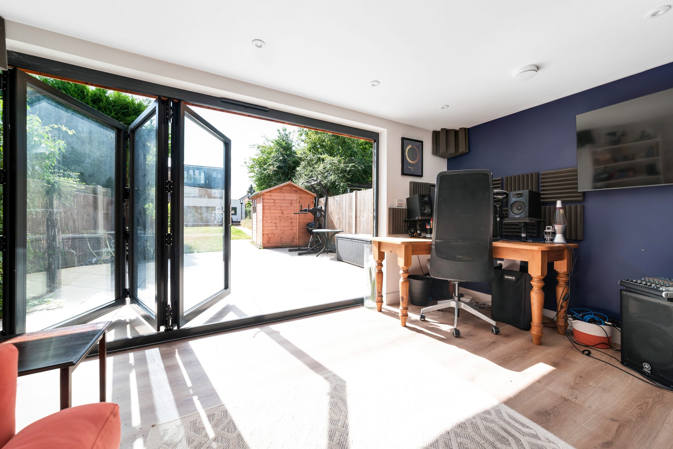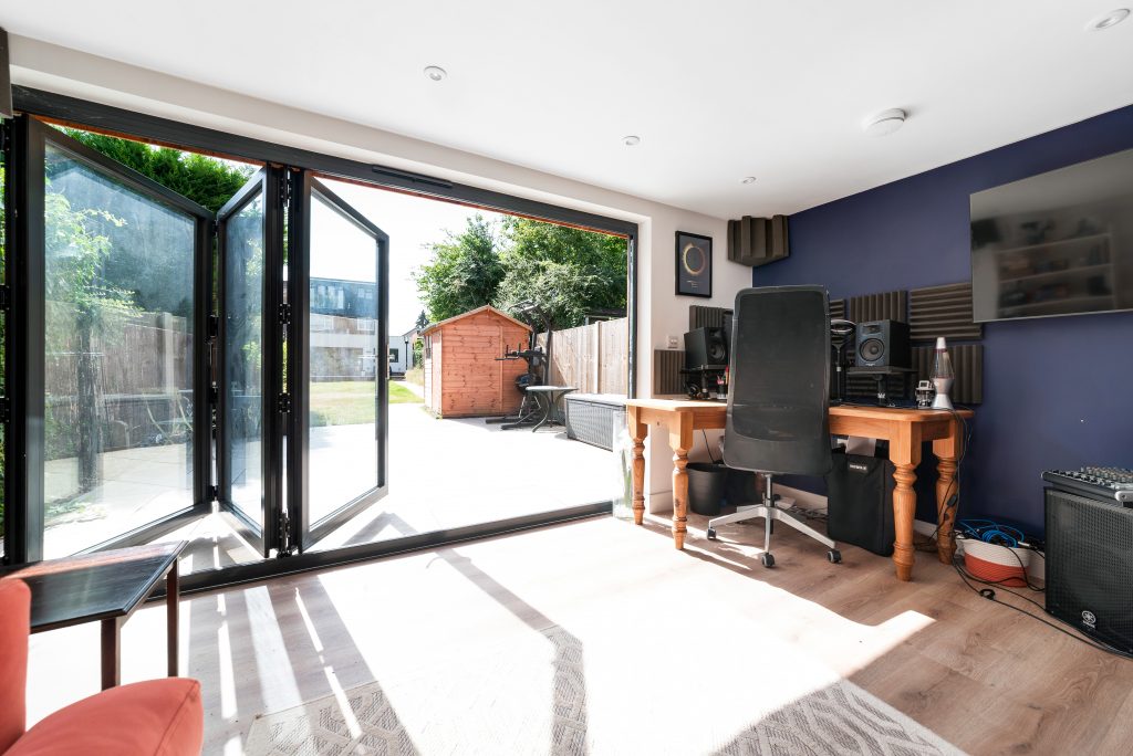 This layout allows the room to function as both a place for creative work and a space for relaxation, with each half of the room clearly defined yet flowing naturally together. The aluminium bifold doors enhance this sense of openness, filling the space with natural light and providing uninterrupted views of the garden, which adds a calming, restorative element to every session spent inside.