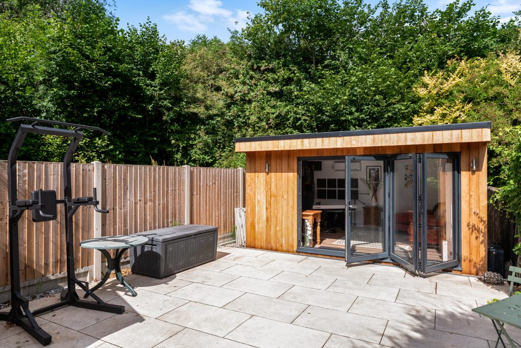 The garden room’s exterior features natural cedar cladding, giving it a warm, timeless aesthetic that complements the surrounding greenery. Across the front, aluminium bifold doors open fully, flooding the interior with natural light and creating a seamless indoor-outdoor connection. The overhang of the Modern Range design adds architectural interest and provides a subtle sheltered area outside, ideal for pausing between creative sessions or simply enjoying the garden views.